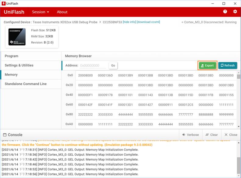 | CC2538SF53 | Flash | 0x00200000 | 0x0027FFFF |